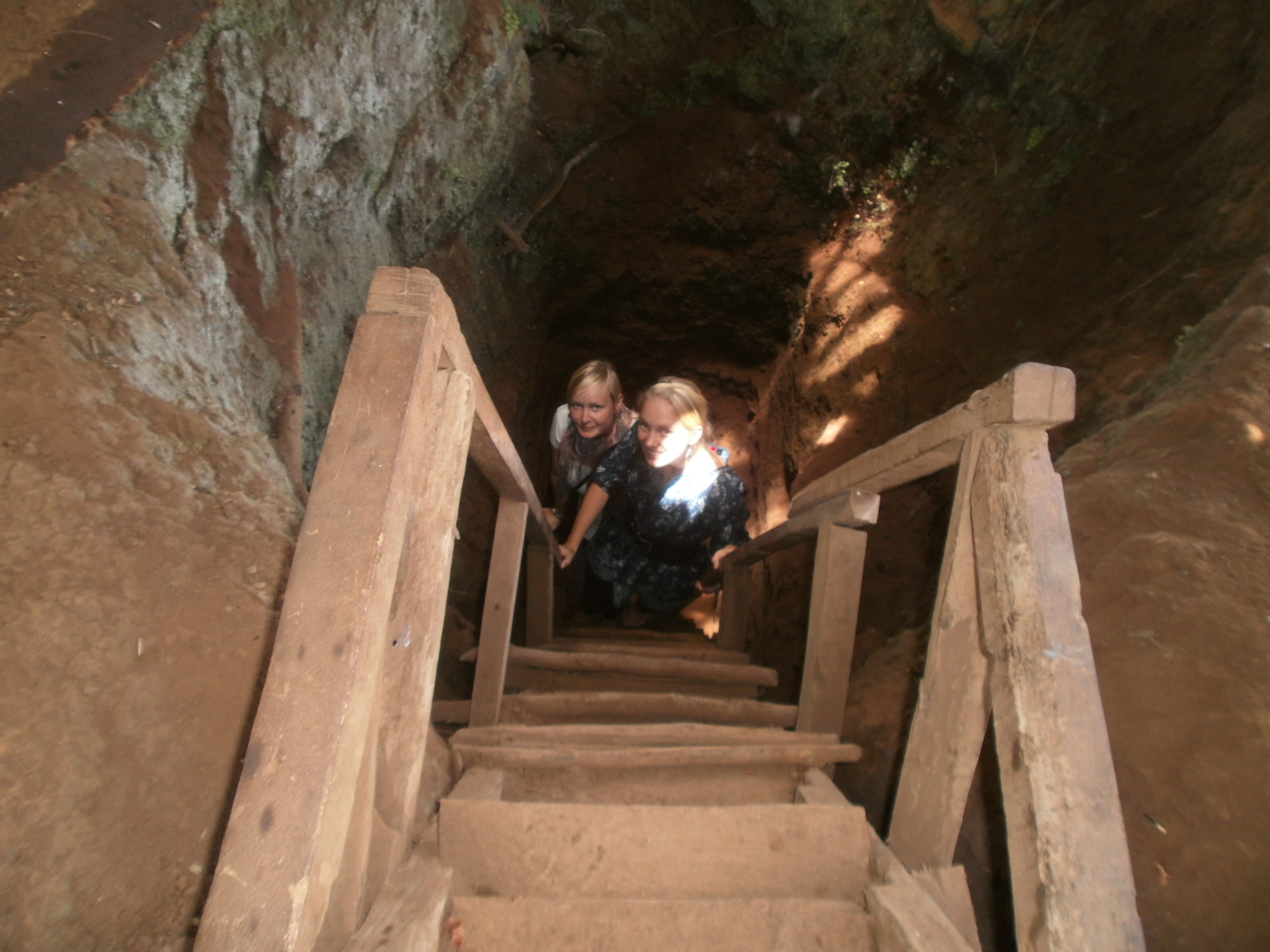 Zusammen mit einem Guide sind wir von dort aus zunächst zu einer Höhle gegangen, indem sich vor 200 Jahren der Stamm der Chagga vor den Massai versteckt hat. Weil die Chagga körperlich klein und zierlich und die Massai groß sind, war die Höhle sehr eng und niedrig.